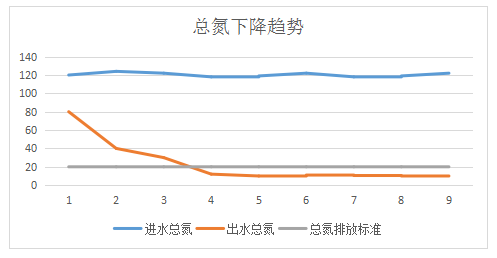 采用邁葳生化修復(fù)方案后,出水總氮由80mg/L持續(xù)下降,最終穩(wěn)定出水TN在10mg/L左右,達(dá)到一級(jí)B排放標(biāo)準(zhǔn)。