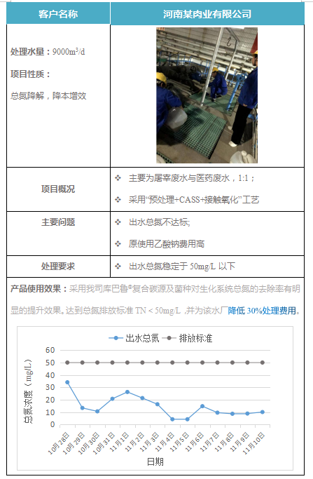 技術(shù)方案:在不改變水站原有設(shè)施的條件下,采用生化系統(tǒng)菌群優(yōu)化及針對(duì)性營(yíng)養(yǎng)素組合的方案,使用我司復(fù)合碳源101b與總氮激活菌101,將系統(tǒng)出水總氮穩(wěn)定降至15 mg/L以下。