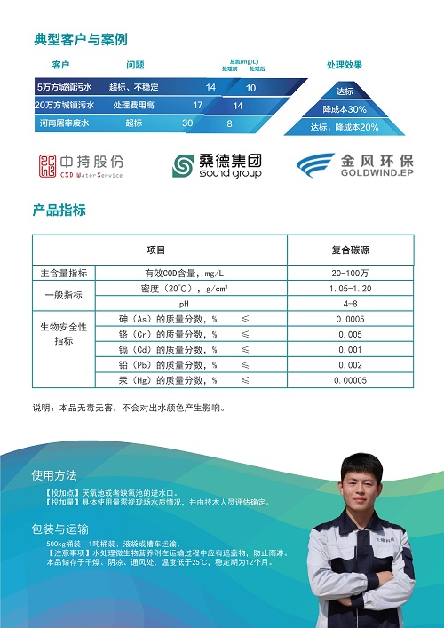 復(fù)合碳源是我司研發(fā)工程師針對(duì)反硝化細(xì)菌專門定制的一種新型碳源,性價(jià)比高于淀粉、葡萄糖、甲醇、乙醇、乙酸鈉等傳統(tǒng)碳源。能快速促進(jìn)反硝化脫氮異養(yǎng)菌群的快速繁殖、提高污水總氮去除的效果,主要針對(duì)城鎮(zhèn)污水、部分工業(yè)廢水。復(fù)合碳源101系列共有4個(gè)型號(hào),分別為復(fù)合碳源101b、101c、101d、101e。