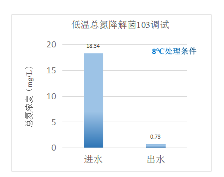 通過技術(shù)人員現(xiàn)場投加低溫總氮降解菌103,再配合現(xiàn)場生化系統(tǒng)運(yùn)行條件控制、優(yōu)化,達(dá)到如下效果: